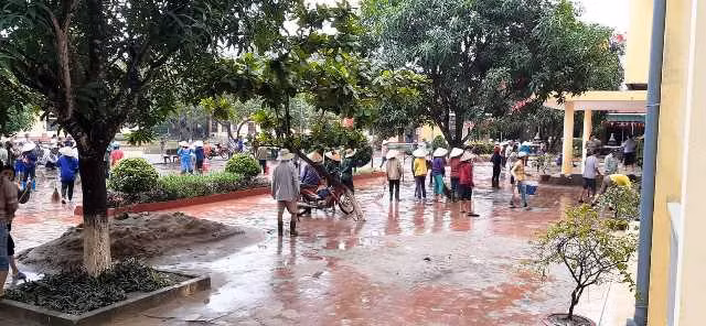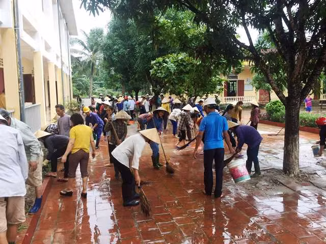 Ngay từ sáng sớm, phụ huynh mang theo chổi, thau chậu, cuốc xẻng đến trường cùng giáo viên dọn dẹp khi nước bắt đầu rút. Với phương châm nước rút tới đâu dọn tới đó, thậm chí nước lũ còn đọng lại ở sân, lớp thì dùng thau, chổi hất nước ra ngoài.
