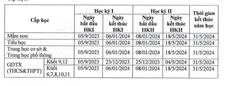 Cũng theo khung kế hoạch này, học kỳ I sẽ kết thúc trước ngày 6/1/2024, hoàn thành kế hoạch giáo dục học kỳ 2 trước ngày 18/5/2024 và kết thúc năm học trước ngày 31/5/2024.