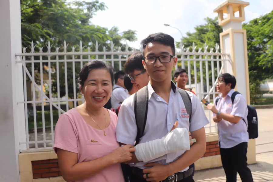Từ hôm con bị tai nạn, vợ chồng tôi rất lo lắng, chỉ sợ ảnh hưởng đến kết quả của kỳ thi. Mấy hôm nay cả 2 vợ chồng tôi lên ở nhờ nhà người quen để đưa con đi thi. Sau môn thi Ngữ văn, thấy con tự tin, vui vẻ bước ra khỏi trường thi thì tôi cũng yên tâm phần nào”.