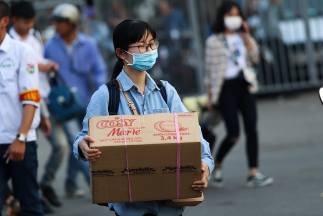 | Tay xách nách mang, lỉnh kỉnh đồ đạc mang từ quê ra. |