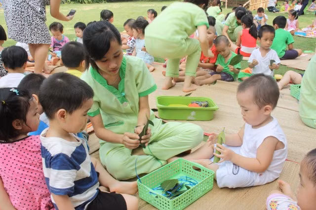 Tiếng Anh và phương pháp thực hành Montessori cũng được Việt hoá qua những hoạt động như tập làm món cơm nắm muối vừng, hoa quả xiên…