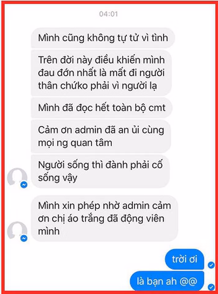 “Mình cũng không tự tử vì tình. Trên đời này điều khiến mình đau đớn nhất là mất đi người thân chứ không phải người lạ. Mình đã đọc hết toàn bộ bình luận, cảm ơn admin đã an ủi cùng mọi người quan tâm. Người sống thì đành phải cố sống vậy. Mình xin phép nhờ admin cảm ơn chị áo trắng đã động viên mình”.