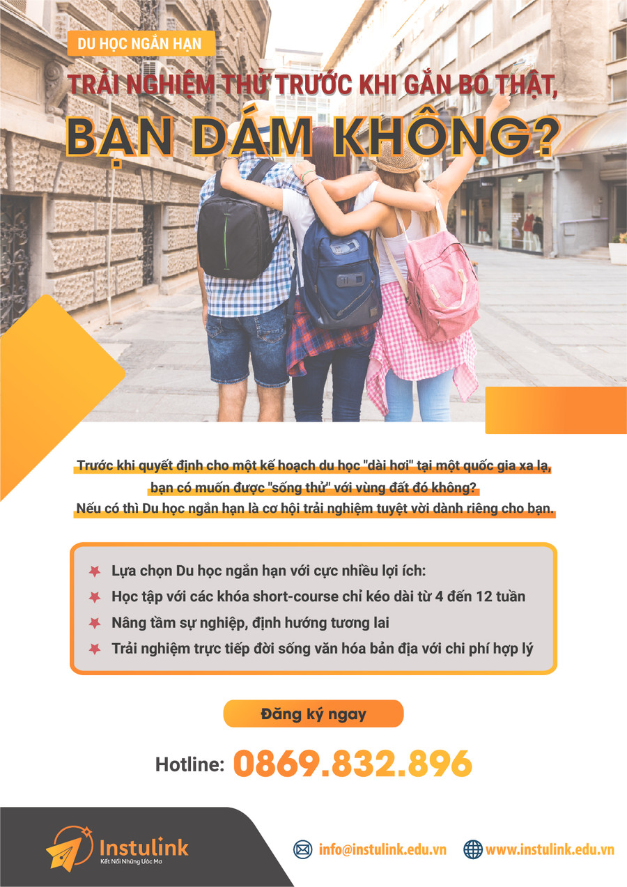 Với những lợi ích trên đây, liệu bạn muốn cho mình cơ hội được bước ra khỏi vùng an toàn để được khám phá thế giới, hoàn thiện bản thân nhờ du học ngắn hạn? Công ty TNHH quốc tế Instulink tự hào là đơn vị giàu kinh nghiệm trong việc hỗ trợ xây dựng lộ trình sự nghiệp cá nhân, cung cấp trực tiếp các chương trình du học ngắn hạn phù hợp với mong muốn và nhu cầu của bạn tại bất kỳ đất nước nào bạn yêu thích; đặc biệt tại Anh, Úc, Mỹ, Canada, New Zealand. Ngoài ra còn có trại hè, trại đông dành cho nhiều lứa tuổi. Liên hệ với Instulink để biết thêm chi tiết.