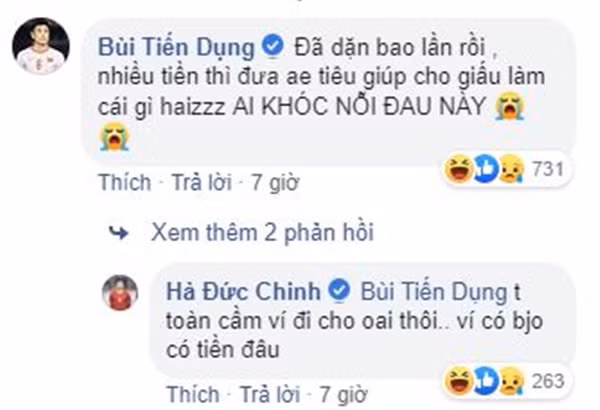 Hai anh em Tiến Dũng - Tiến Dụng vốn là bạn thân của Đức Chinh từ lứa U23, vậy nên thật khó để họ không kiếm cớ troll cậu bạn. Nếu như Tiến Dũng vừa ra sức kêu gọi mọi người tìm ví giúp Đức Chinh vừa không quên nhắc khéo khoản nợ của bạn với mình thì Tiến Dụng cũng "không phải dạng vừa" khi tỏ ra tiếc nuối cho Chinh "đen".