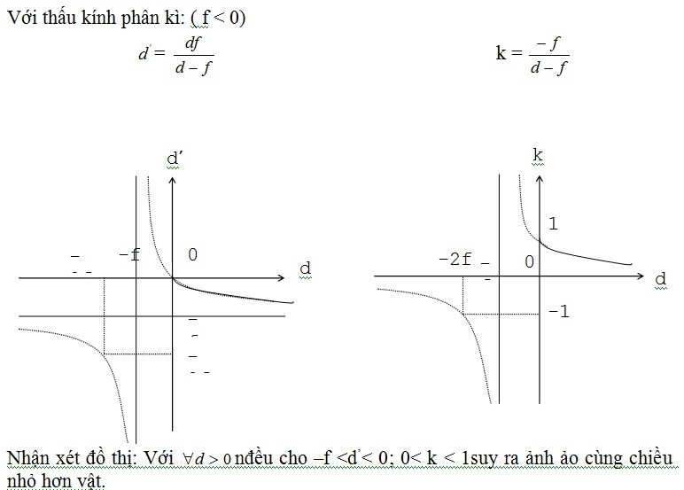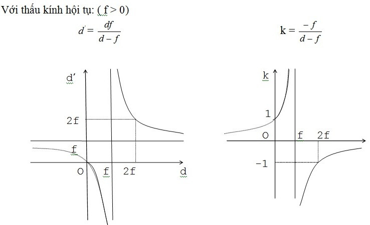 Cụ thể như sau: Vẽ hai đồ thị ứng với mỗi loại thấu kính, đó là đồ thị về mối quan hệ giữa d và d’, và đồ thị sự phụ thuộc của k vào d.