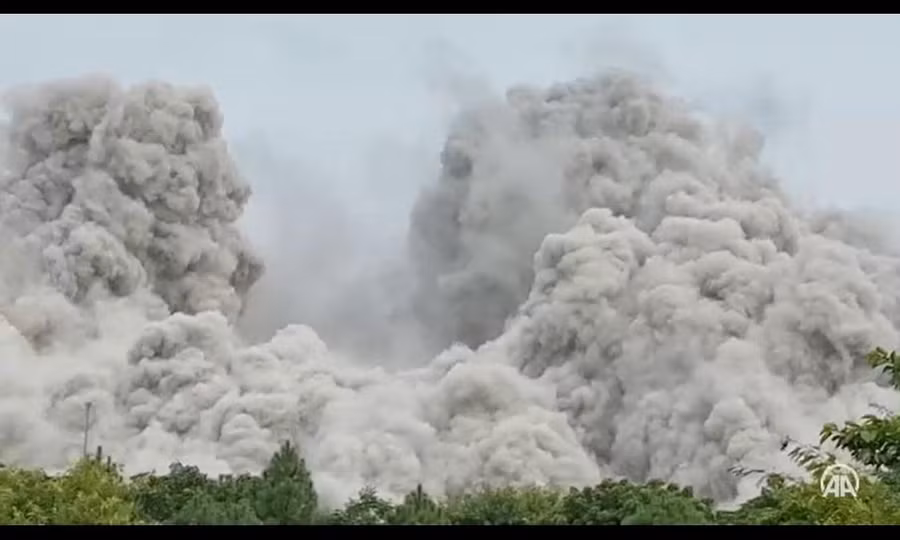 Cụ thể, khoảng 14h30 theo giờ địa phương (16h giờ Việt Nam) ngày 28/8, các hình ảnh trực tiếp trên truyền hình cho thấy hai tòa nhà Apex và Ceyane đổ sụp xuống đất chỉ trong vòng vài chục giây, tạo ra một đám mây bụi khổng lồ bao phủ khu vực.