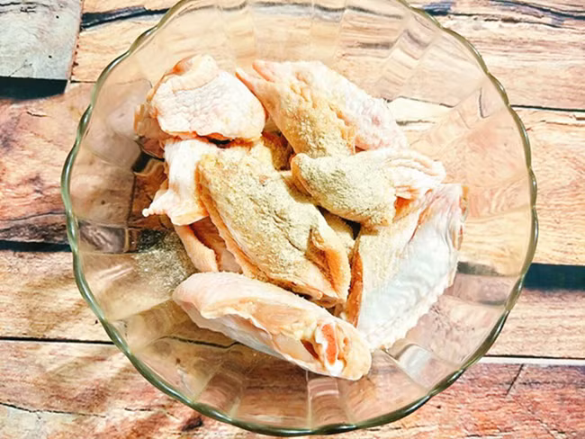– Bắc chảo dầu lên bếp, cho cánh gà vào chiên đến khi vàng đều cả 2 mặt thì gắp ra đĩa.