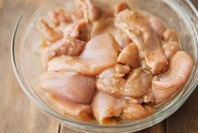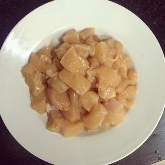 – Ức gà rửa sạch, cắt thành miếng vuông cạnh khoảng 1cm. Sau đó, đem ướp với sốt thịt nướng, nước tương, bột tiêu, bột ớt, đảo đều tay và ướp trong 40 phút.