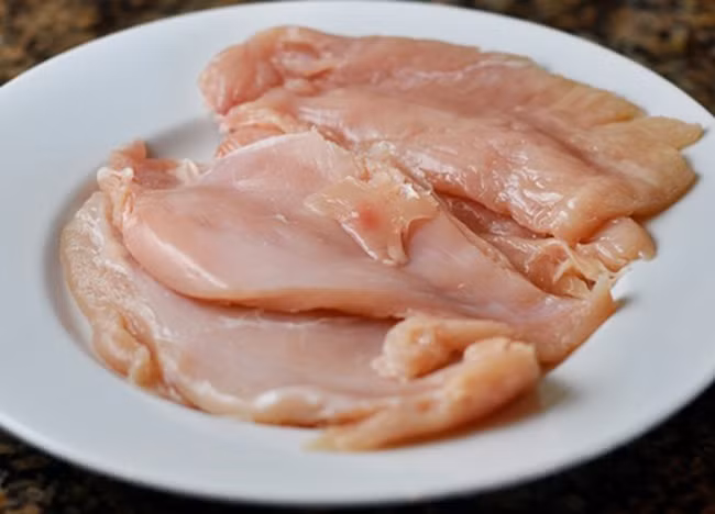 – Gà bạn chọn những phần nhiều thịt, sau đó thái thịt gà thành miếng mỏng và ướp với tỏi băm nhuyễn trong vòng 5 phút. Sau đó, phủ một ít bột mì lên miếng thịt.