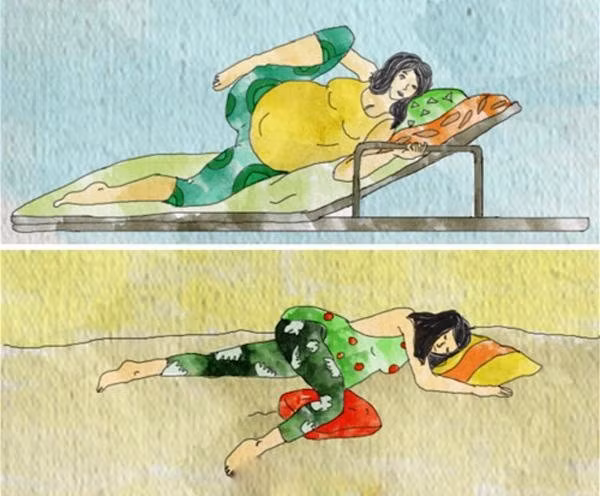 Khi nằm, mẹ hãy mở rộng hai chân hoặc dùng gối hỗ trợ để thúc đẩy quá trình chuyển dạ diễn ra nhanh hơn.