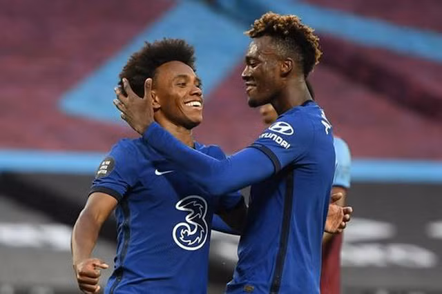 Abraham chia vui với Willian sau khi cầu thủ người Brazil mở tỉ số