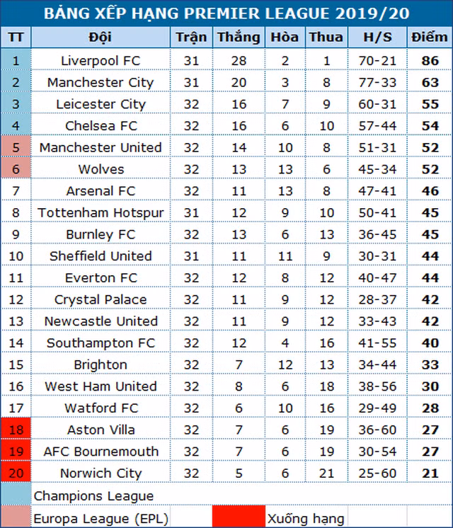 Trắng tay ở vòng 32 khiến Chelsea vẫn giậm chân ở điểm số 54, họ vẫn kém đội thứ ba Leicester một điểm, nhưng chỉ còn hơn đội xếp thứ 5 Man Utd có hai điểm. Cuộc đua top 4 Premier League đang trở nên nóng hơn khi Leicester, Chelsea đang thất thường, nhóm bám đuổi gồm Man Utd, Wolves lại đang thăng hoa.