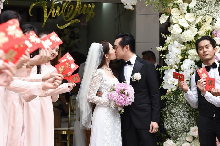 Trước khi tổ chức tiệc cưới tại một khách sạn sang trọng ở TP.HCM với sự góp mặt của nhiều bạn bè nghệ sĩ nổi tiếng Vbiz, cặp đôi đã làm lễ rước dâu theo đúng nghi thức truyền thống ở tư gia.