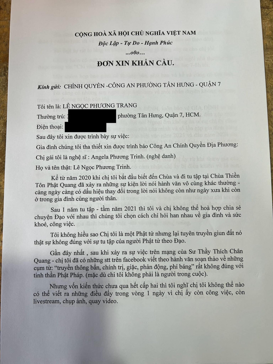 Mới đây, trên trang cá nhân, em gái Angela Phương Trinh đã gây xôn xao khi chia sẻ hình ảnh đơn khẩn cầu mà cô và gia đình gửi đến cơ quan chức năng.
