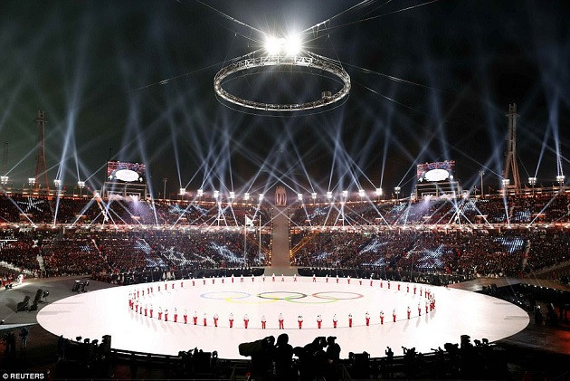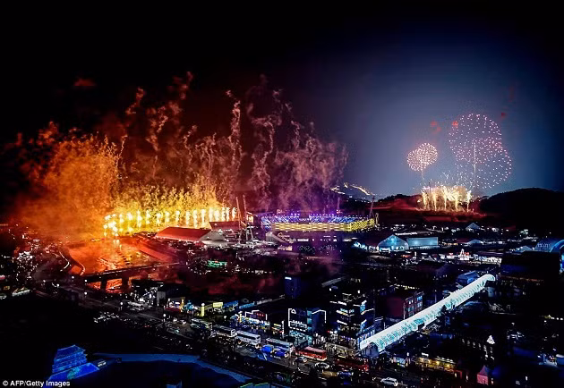 Em gái của nhà lãnh đạo Triều Tiên Kim Jong un là Kim Yo Jong ngồi không xa Phó Tổng thống Mỹ sau khi bắt tay Tổng thống Hàn Quốc Moon Jae-in khi họ bước vào sân vận động dự lễ khai mạc.