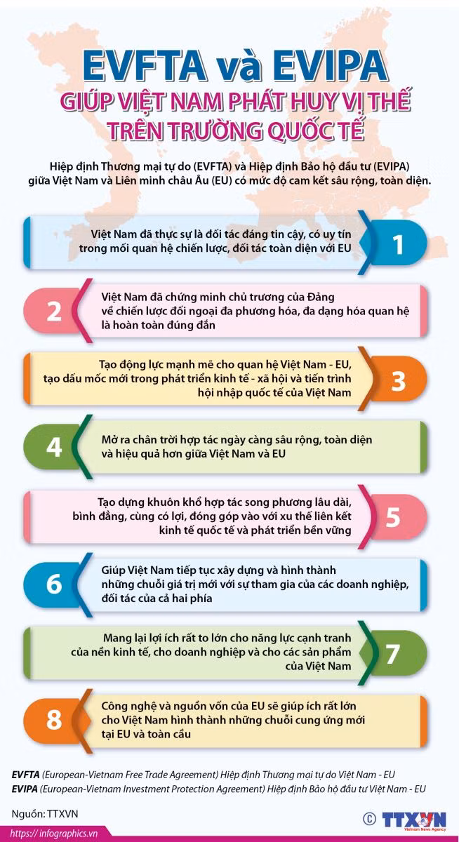 Nghị quyết phê chuẩn Hiệp định Thương mại tự do giữa Việt Nam và Liên minh Châu Âu (EVFTA), và Hiệp định Bảo hộ đầu tư giữa Việt Nam với Liên minh Châu Âu và các nước thành viên Liên minh Châu Âu (EVIPA) sẽ được biểu quyết thông qua tại kỳ họp thứ 9, Quốc hội khóa XIV.