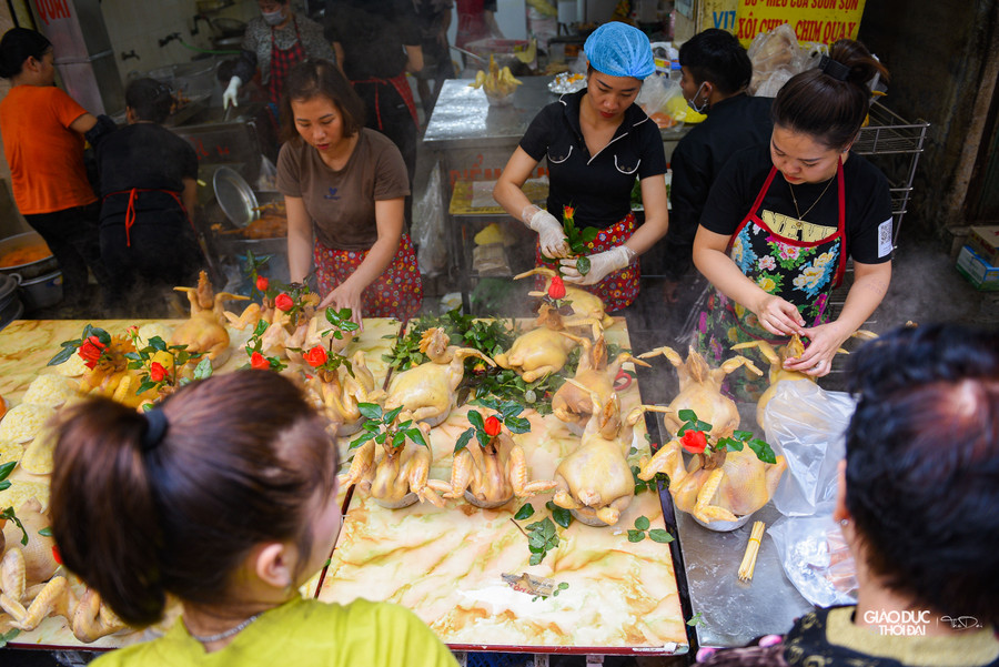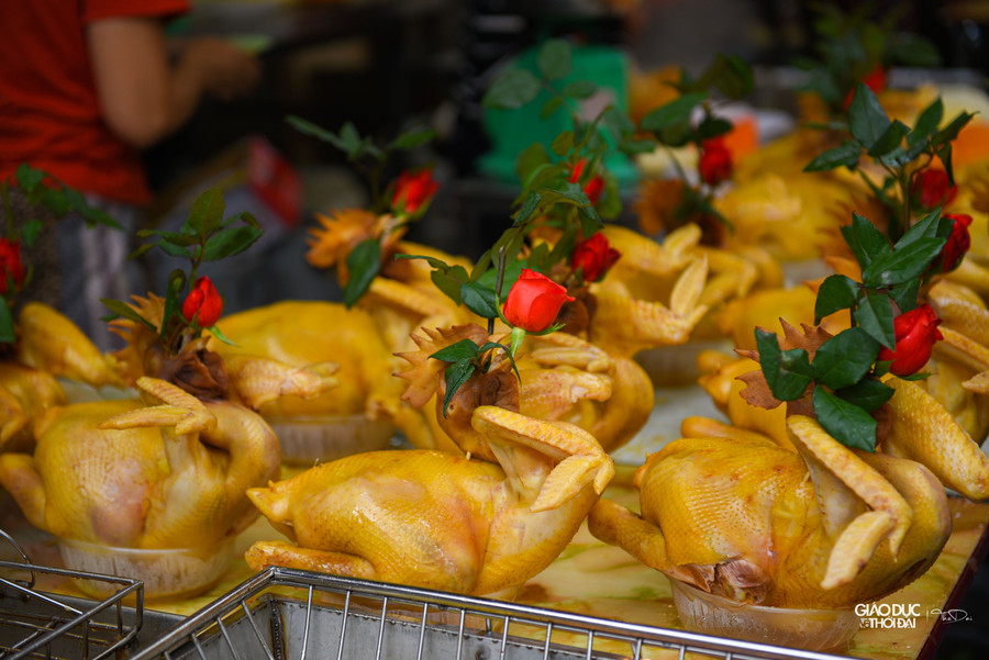 Trong phố cổ Hà Nội có một khu chợ bán đồ ăn sẵn nổi tiếng với những con gà cúng có giá cao ngất ngưởng nhưng vẫn bán tới cả trăm con mỗi ngày.