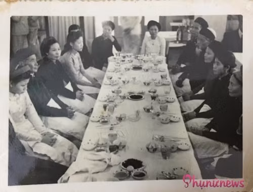 Có thể thấy nét văn hóa truyền thống xưa, các chị, các cô, các bà đã lấy chồng đều vấn tóc, dùng khăn đóng, còn các cô gái trẻ chưa chồng đều búi tóc cao, mái cuộn. Trong ảnh là cô dâu cùng dàn phù dâu xinh đẹp, toàn mỹ nữ Hà thành thế kỷ trước