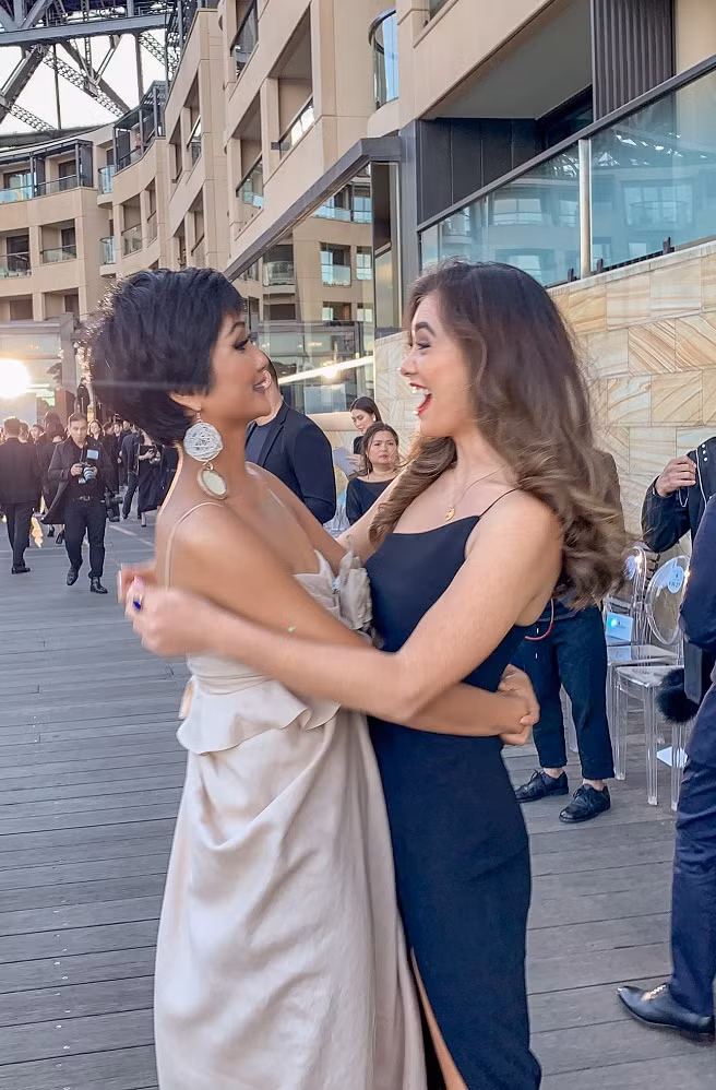 2 nàng hậu rất hạnh phúc, ôm nhau sau nhiều tháng không gặp. Miss Universe Australia không ngớt lời khen ngợi sắc vóc của H"Hen Niê khi chứng kiến sự rạng rỡ của cô gái đánh bại nhiều mỹ nhân lọt Top 5 tại đấu trường sắc đẹp lớn nhất hành tinh vào năm 2018.