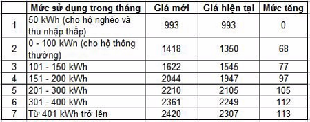 Theo biểu giá bán điện ban hành kèm theo Thông tư số 19/2013/TT-BCT của Bộ Công thương, các hộ nghèo và thu nhập thấp sử dụng điện sinh hoạt đến 50 kWh/tháng sẽ không tăng chi, các hộ sử dụng điện sinh hoạt 100 kWh/tháng tăng chi 6.800 đ/tháng, sử dụng 150 kWh/tháng tăng chi 10.650 đ/tháng, sử dụng 200 kWh/tháng tăng chi 15.500 đ/tháng, sử dụng 300 kWh/tháng tăng chi 26.000 đ/tháng, sử dụng 400 kWh/tháng tăng chi 37.200 đ/tháng.