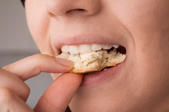Nhiều người cho rằng khi nhai, đặc biệt là nhai bánh mì sẽ tránh làm chảy nước mắt khi cắt hành. Bạn hãy nhai thật chậm, cho miếng bánh mì ra khỏi miệng một chút. Lúc đó miệng của bạn sẽ được thấm nước, mặc dù hơi khó chịu nhưng cách này sẽ giúp cho mắt bạn không bị cay.