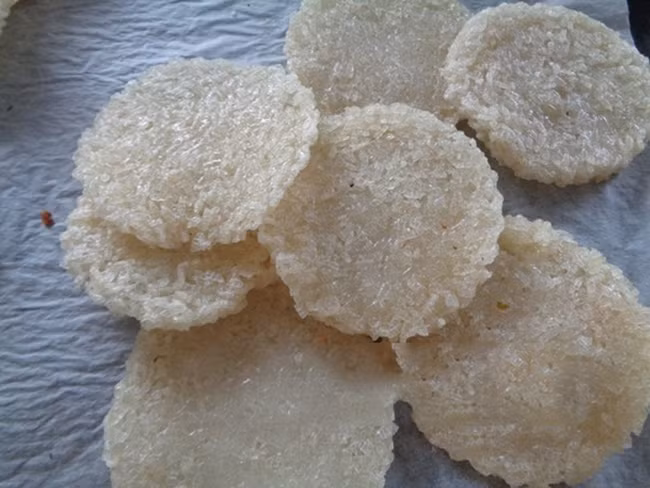 2, Khi cơm chín, các bạn để hơi nguội rồi cho lên màng thực phẩm cán hơi mỏng, sau đó cắt khoanh tròn (bạn có thể dùng khuôn hay miệng ly nước để cắt). Xếp từng khoanh gạo lên khay phơi nắng thật khô hay sấy khô trong lò ở nhiệt độ 100 độ C.