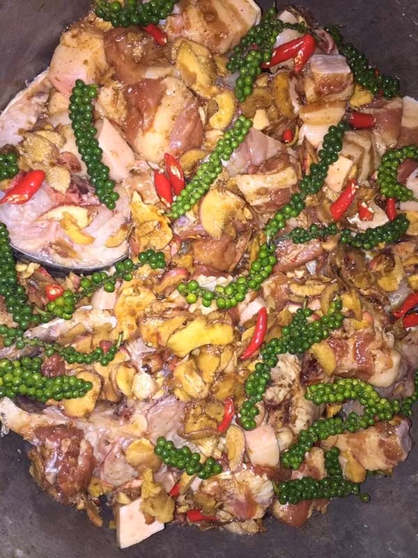 - Tiếp tục xếp mía và giềng cho kín đáy nồi rồi xếp cá, thịt ba chỉ, hạt tiêu xanh và ớt lên trên.
