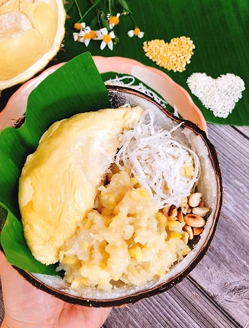 - Xôi sầu riêng khi ăn có thể thêm nước cốt dừa, dừa sợi và đậu phộng rang lên trên.