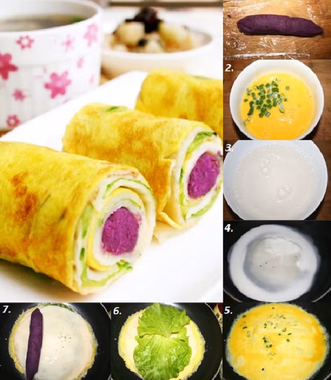 Thêm một công thức trứng cuộn với phần nhân tưởng chừng quen thuộc song hấp dẫn vô cùng, đó chính là khoai lang tím. Khoai lang tím hấp chín, nghiền nhuyễn được bọc bởi lớp bột mì và trứng chiên chín vàng vừa thơm ngọt lại bùi bùi, ngậy ngậy, ăn rất thích.