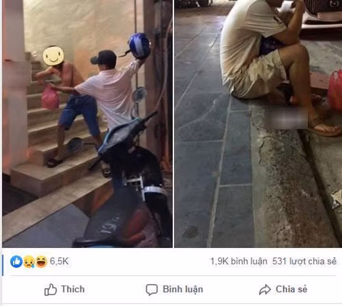 Kèm theo chuyện này là ảnh nam thanh niên đội nón lưỡi trai cầm mũ bảo hiểm làm động tác đánh người cởi trần, sau đó ngồi một mình trên vỉa hè.