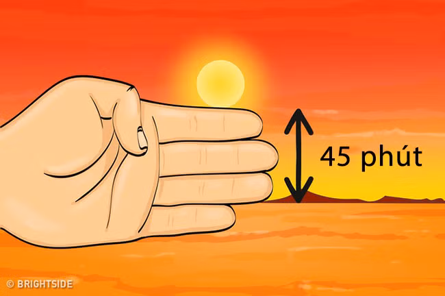 Tìm địa điểm thông thoáng, chụm 4 ngón tay đặt theo phương nằm ngang, giữ bàn tay sao cho Mặt trời ở ngay phía trên ngón trỏ. Khoảng cách giữa Mặt trời và đường chân trời tương ứng với số ngón tay. Theo đó, cứ 1 ngón tay (tính từ ngón trỏ trở xuống) tương đương với 15 phút.