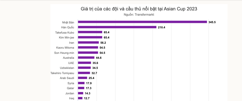 Trong nhóm 20 cầu thủ đắt giá nhất giải tại Asian Cup 2023, tuyển Nhật Bản có 13 cầu thủ, Hàn Quốc có 4. Số còn lại là cặp tiền đạo Mehdi Taremi và Sardar Azmoun của Iran và trung vệ Harry Souttar của Australia.