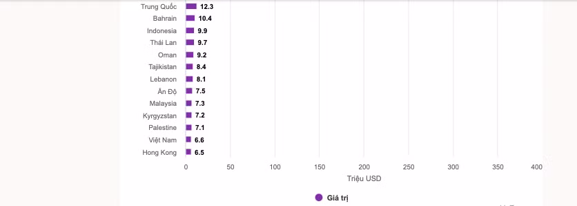 Thái Lan và Malaysia lần lượt xếp thứ 15 (9,7 triệu USD) và 20 với trị giá 7,3 triệu USD.