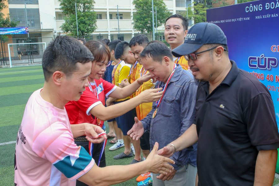| Ông Dương Quang Ngọc - Chủ tịch Công đoàn Viện Khoa học Giáo dục Việt Nam trao huy chương cho các đội bóng. |
