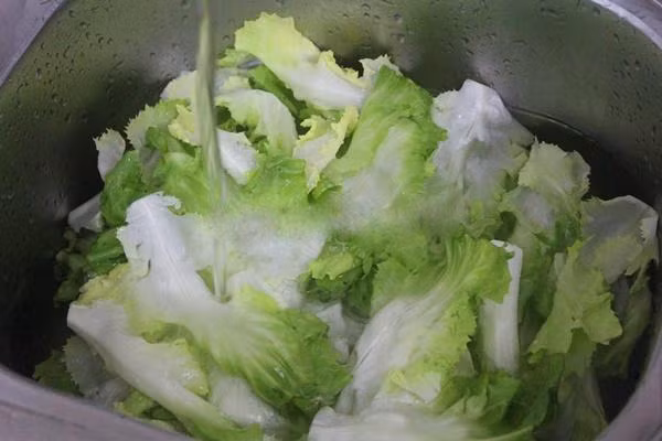 Rau xà lách tách từng lá, rửa sạch, ngâm với muối.