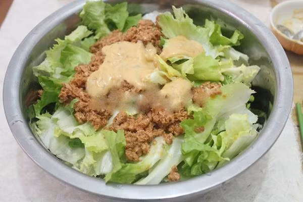 Dùng thố lớn, cho xà lách, cá ngừ và xốt vào trộn thật đều. Sau khi trộn xong, bạn có thể dùng ngay.