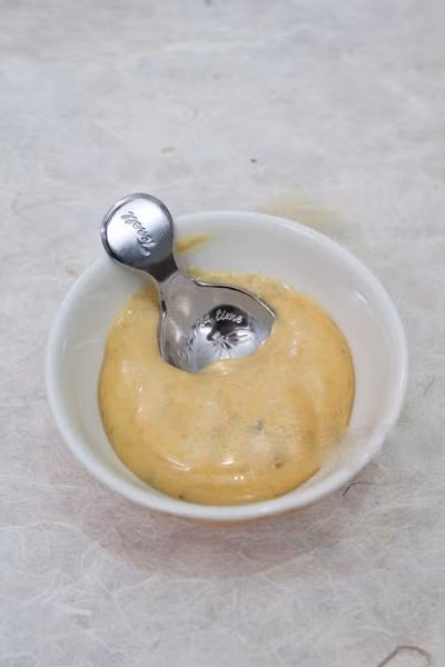 Trộn 4 muỗng canh xốt mayonnaise, 1 muỗng canh mù tạt vàng, 1 muỗng canh mật ong và 2 muỗng café nước cốt chanh thật đều.