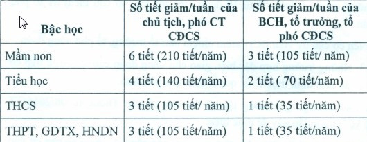 Lưu ý: Việc giảm tiết dạy hằng tuần cho cán bộ kiêm nhiệm công tác công đoàn có thể ảnh hưởng đến phân công giảng dạy cho những người trực tiếp đứng lớp. Do đó, các cơ sở có thể áp dụng linh hoạt bằng việc bố trí tiết giảm dồn vào một số buổi trong tháng, trong học kỳ, trong năm học hoặc thanh toán tiền thừa giờ.