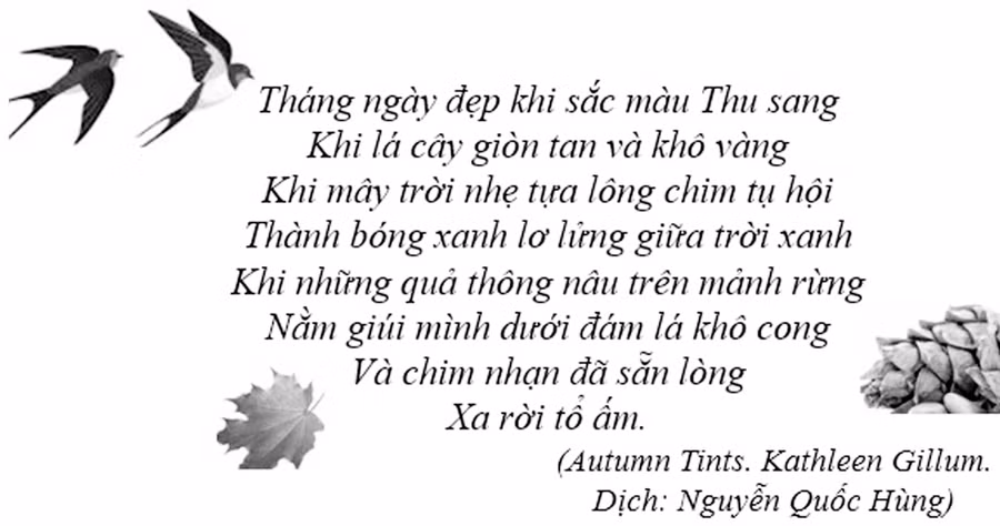 Nhà thơ John Keats đã nói rằng thu là “mùa của sương muối và mùa của thành quả chín bùi”, mùa mà những bông hoa cuối cùng của mùa hạ héo tàn, mùa táo chín mọng, mùa lá đổi màu và mùa của màn đêm kỳ diệu. Trong những giờ rảnh rỗi, tôi hay đi lang thang ở ngoại ô thành Nottingham. Cái đẹp của mùa thu miền trung du này giống với mùa thu ở quê tôi, nó bộc lộ nỗi cô liêu và tan tác trong cánh lá vàng bay bay, nhưng nó khác quê tôi, vì nó xán lạn một màu vàng: Lá cây khô vàng; mây trời cũng lâng lâng bay, quả thông già nặng trịch cũng rơi giúi vào trong đống lá khô và chim nhạn đã chuẩn bị cho chuyến đi xa tránh mùa đông giá lạnh.