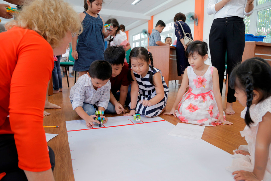 Với một bộ lego, mỗi nhóm HS thảo luận với nhau để có thể lắp ghép thành chiếc máy bắn đá chỉ trong vòng 10 – 15 và sau đó thi bắn xem nhóm nào bắn được xa nhất. Tiếng Anh được sử dụng trong giờ học như là phương tiện để chuyển tải kiến thức, ngoài GV người nước ngoài còn có một GV người Việt trợ giảng.