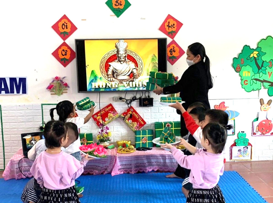 Tại Trường Mầm non Nam Hồng, nhiều năm qua tập gói bánh chưng dâng lễ Vua Hùng đã trở thành hoạt động được các giáo viên đưa vào chương trình học cho trẻ. Từ những bìa cartoon và giấy màu, lá chuối... các giáo viên đã tỉ mỉ hướng dẫn các em quy trình để làm nên một chiếc bánh chưng – “lễ vật” trong dịp Giỗ Tổ Vua Hùng. Thông qua hoạt động, các giáo viên đã kể, chiếu phim cho các em về sự tích gói bánh chưng cũng như truyền thuyết về các Vua Hùng.
