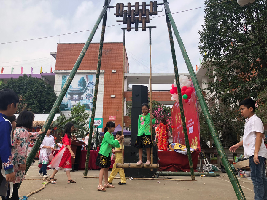 | Trò chơi đánh đu và ô ăn quan được nhà trường tái hiện tại hội chợ. |