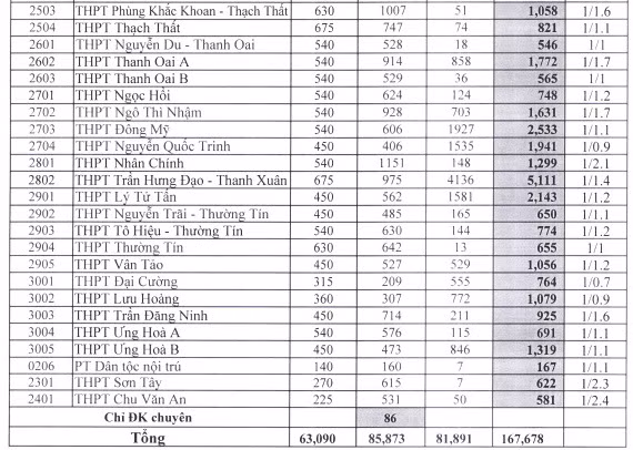 Số liệu này được tổng hợp từ việc đăng ký nguyện vọng dự tuyển của học sinh lớp 9 ở Hà Nội và học sinh tự do, học sinh tỉnh ngoài đã nộp “Phiếu đăng ký dự tuyển vào lớp 10 THPT năm học 2019-2020” tại các trường THCS, phòng GD&ĐT các quận, huyện, thị xã thuộc thành phố Hà Nội.