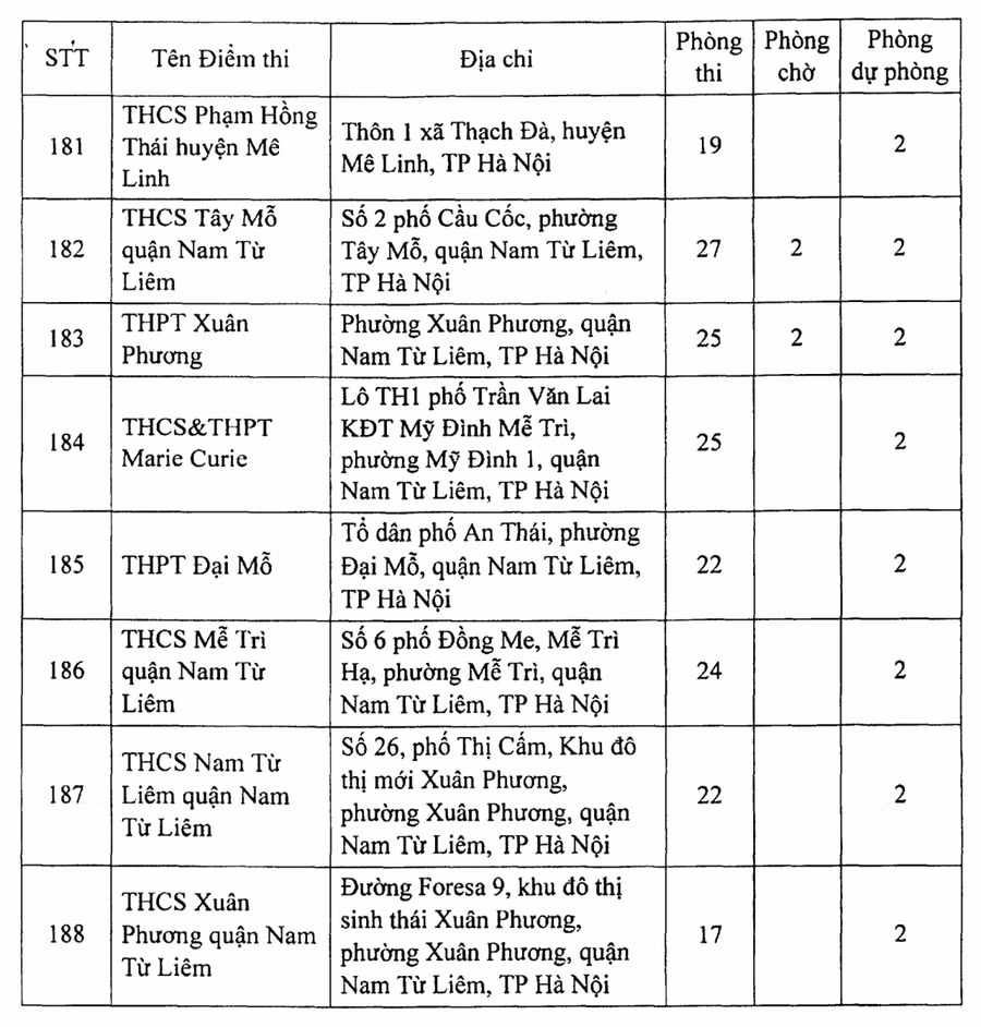 Theo thông báo này, toàn thành phố có 188 điểm thi, điểm thi lớn nhất là THCS Trưng Vương với 45 phòng thi, tiếp theo là THPT Chu Văn An với 43 phòng thi. Địa điểm làm phách bài thi tự luận tại Trường Bồi dưỡng cán bộ quản lý giáo dục Hà Nội. Địa điểm chấm bài thi tự luận tại trường THPT chuyên Hà Nội - Amsterdam. Địa điểm chấm bài thi trắc nghiệm tại Trường Bồi dưỡng cán bộ quản lý giáo dục Hà Nội.