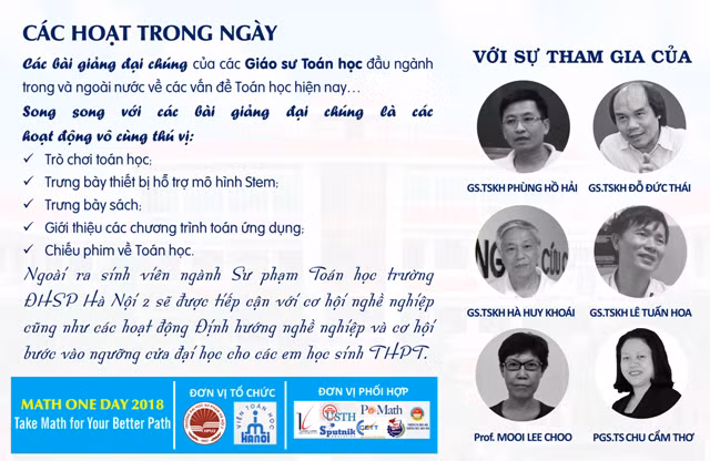 Một ngày với Toán học năm 2018 sẽ diễn ra từ 8h30 đến 16h30 ngày 20/5/2018 (Chủ nhật), tại giảng đường ABCD, Trường ĐHSP Hà Nội 2.