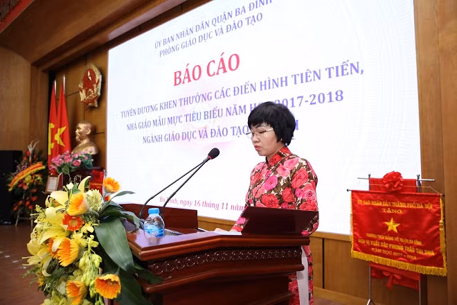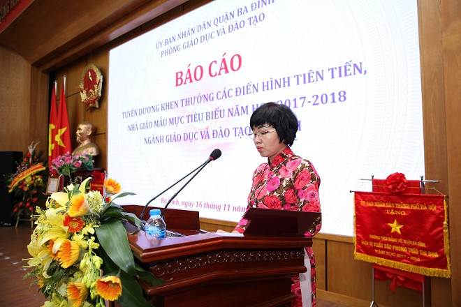 Phát biểu tại buổi lễ, bà Hà Thị Ngọc, Phó phòng Giáo dục quận Ba Đình cho biết, Năm học 2017 – 2018, ngành GD&ĐT quận Ba Đình với tổng số 2518 cán bộ giáo viên, nhân viên đã góp phần tạo nên thành tích chung của ngành GD&ĐT Thủ đô với quy mô phát triển ổn định, đảm bảo 100% trẻ em trong độ tuổi được đến trường, giữ vững chất lượng giáo dục đại trà, chất lượng mũi nhọn. Kế thừa và phát huy những thành tích đã đạt được, ngành GD&ĐT Ba Đình đã gặt hái được nhiều thành công.