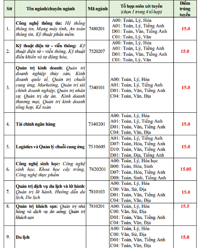 STT | Mã ngành | Ngành đào tạo | Điểm | Tổ hợp xét tuyển |