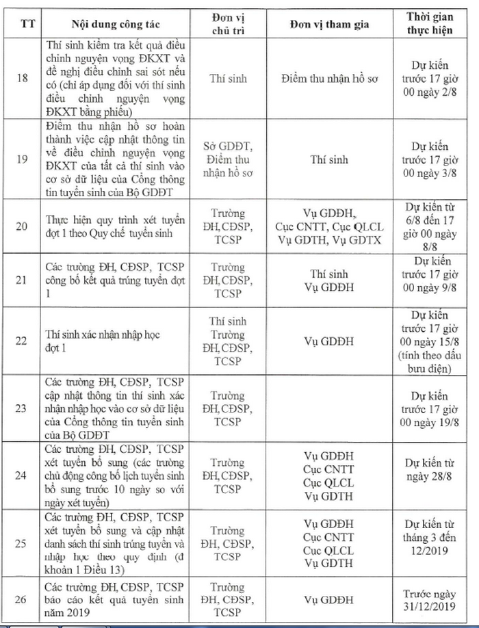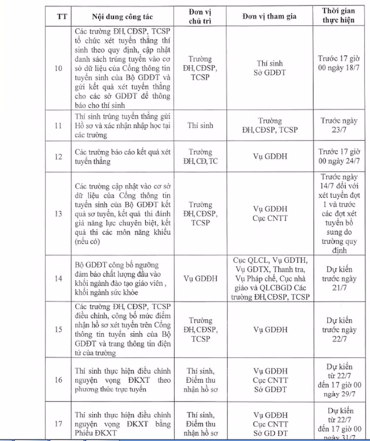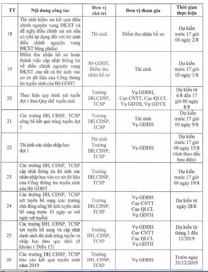 Trước 17 giờ 00 ngày 18/7/2019 các trường tổ chức xét tuyển thẳng thí sinh theo quy định, cập nhật danh sách trúng tuyển vào cơ sở dữ liệu của Cổng thông tin tuyển sinh của Bộ GD&ĐT và gửi kết quả xét tuyển thẳng cho các sở GD&ĐT để thông báo cho thí sinh;