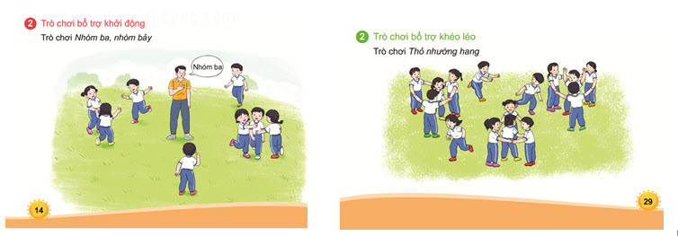 Ví dụ trò chơi Nhóm ba, nhóm bảy (trang 14), Thỏ nhường hang (trang 29):