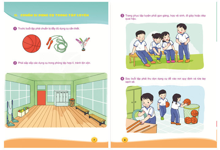 Ví dụ hình ảnh thể hiện cảnh học sinh làm vệ sinh (trang 5, 6), thu dọn dụng cụ sau buổi tập (trang 7, 8):